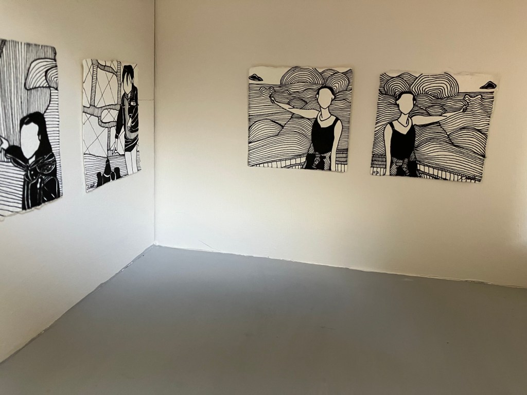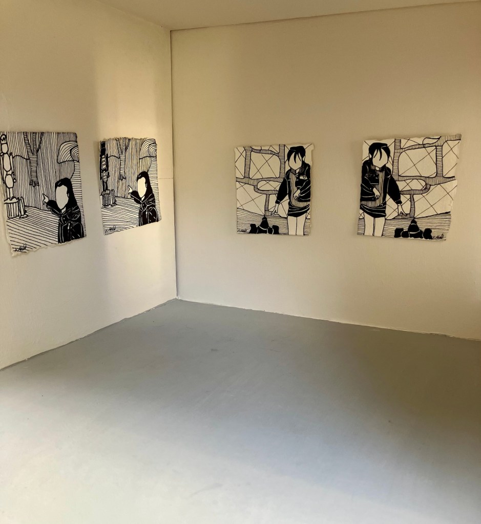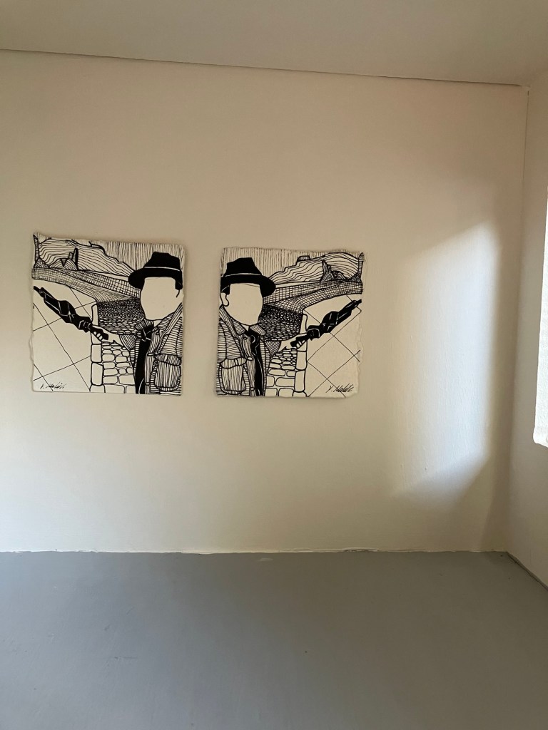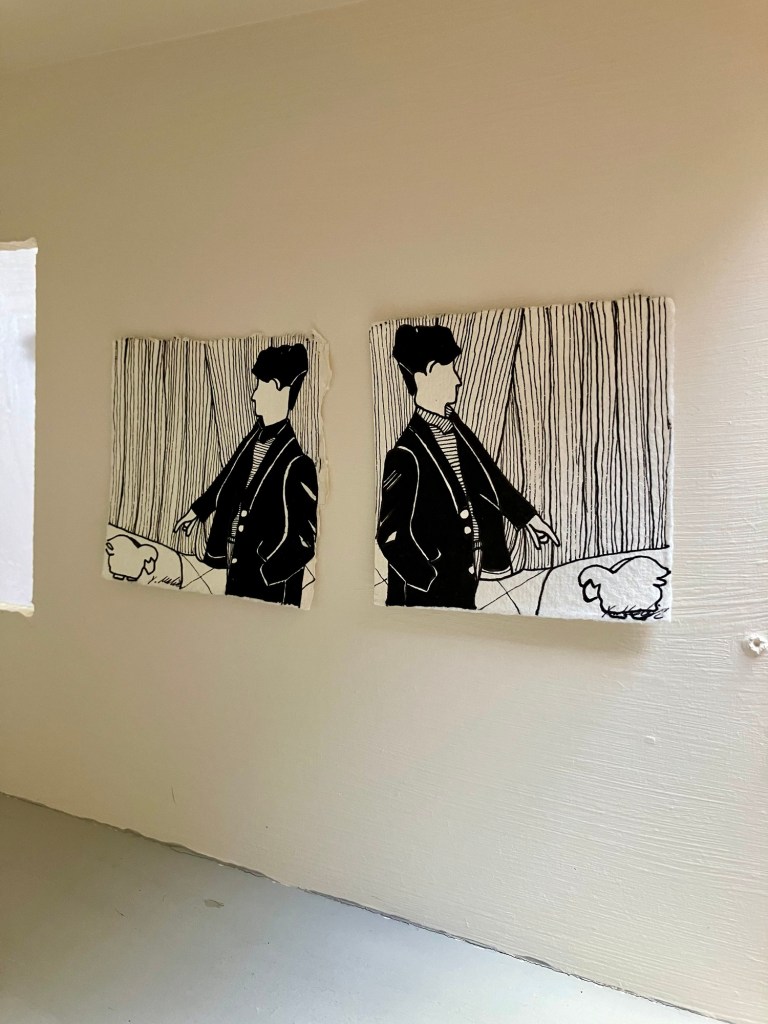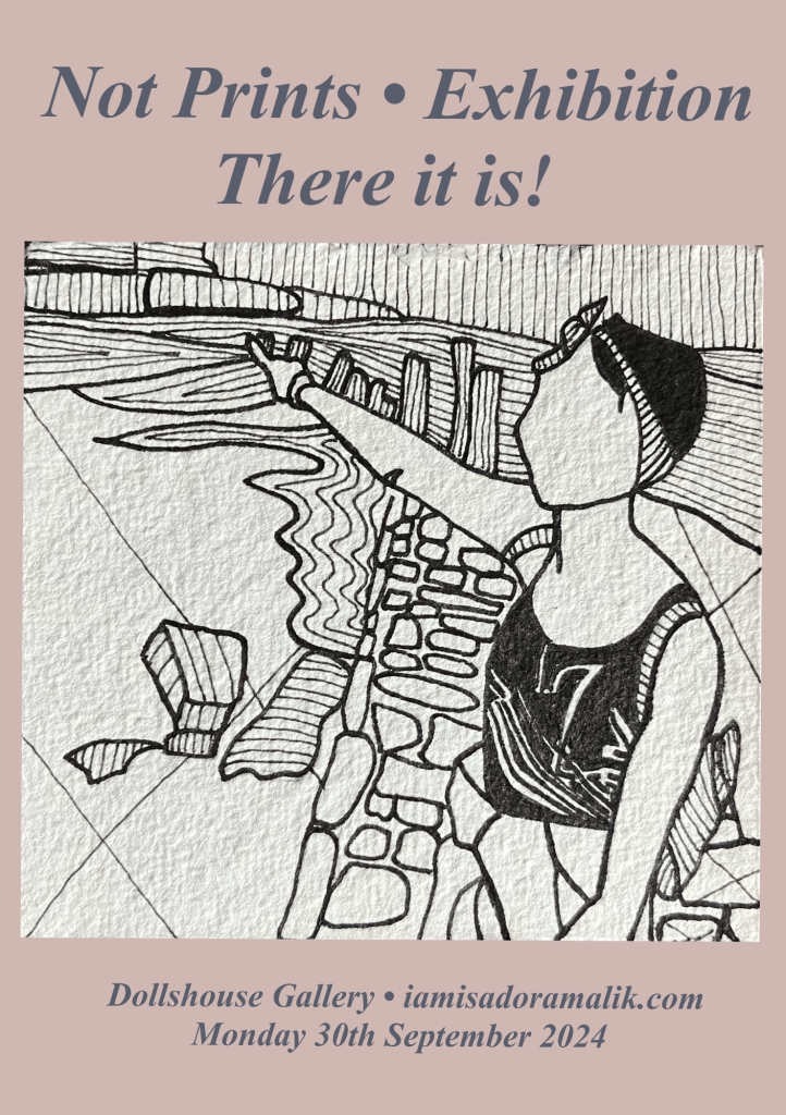 Not Prints are a series of pen and ink drawings that have been replicated by hand to create, seemingly, duplicated or reversed images. In this work I aim to create mystery. I have layered ideas on top of each other, like a work of detective fiction. The images are not intended to be identical but similar enough that they could easily be mistaken for another. All the works in this series also share a theme of ‘there it is’ where the subjects in each image are shown pointing the way. The unifying (seen) theme connects the images as an identifiable series and helps to mask the effect of the copy before it is broken.